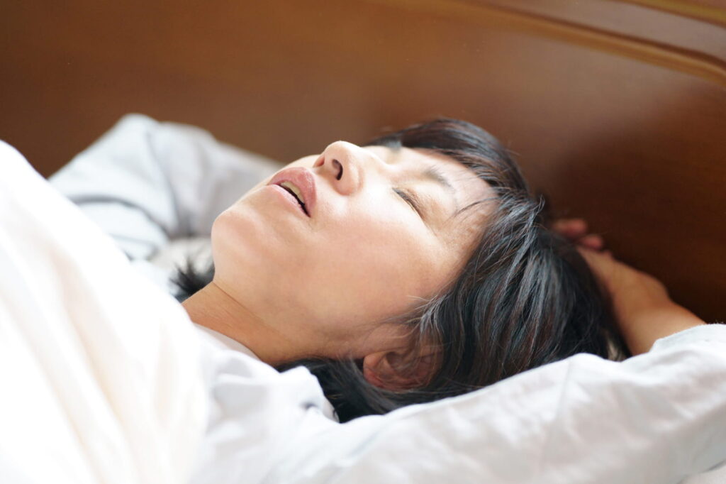 口が開いたまま眠ると、舌や喉の筋肉が緩み、気道が狭くなりやすくなります。その結果、空気の通り道が振動していびきが発生。呼吸が浅くなり、熟睡感が得られません。